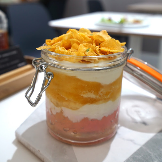 以水果風味的果凍為基底,層層疊上優格、新鮮柳橙片,然後再疊上一層法國依思尼 ISIGNY STE MÈRE奶油製作的鮮奶油, 最後以香脆的玉米片為頂,讓甜點的口感綿滑中帶著香脆。
