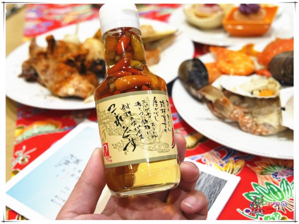 桌上也準備了沖繩的另一項名產『泡盛』,一種用酒泡辣椒醃漬的調味料,酒味還挺重的說。