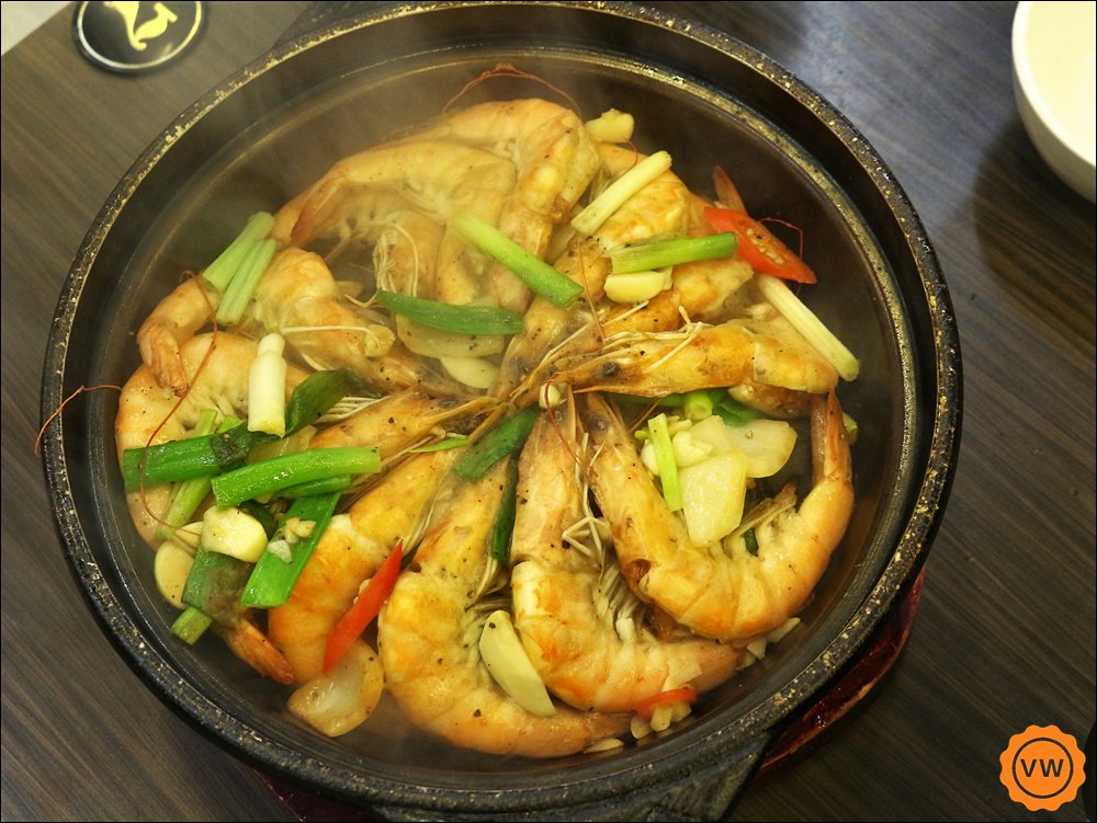 鍋內先放上已先經由高溫加熱過的石頭之後,在上桌之後,再將已事先醃漬過的蝦子放入鍋內,倒入紹興酒之後,再蓋上鍋蓋,以燜烤的方式加速蝦子可以快速熟成,卻又不會過老的料理方式。而且當服務員在開蓋時,那股直衝天花板的白煙還伴隨著陣陣酒香,更是到店時必點的菜色之一!