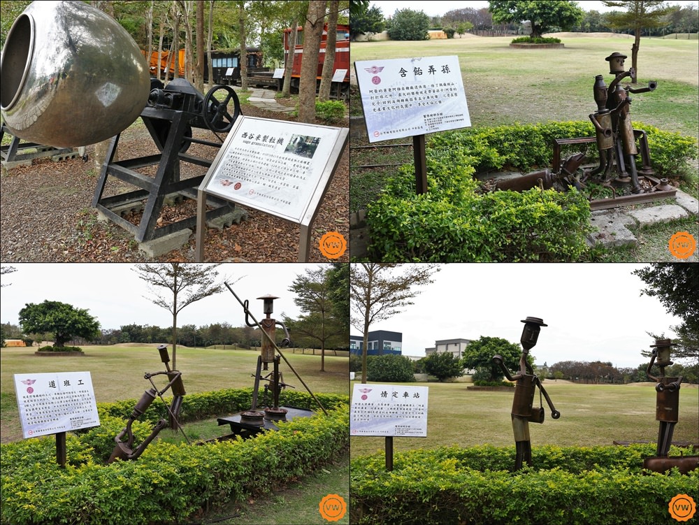 再則在戶外活動區內,還有置放各種糖業用以鐵製器材組合而成的雕塑作品,如道班工、情定車站及含飴弄孫等。而且在這邊還有佔地近5公頃的親子草坪區。
