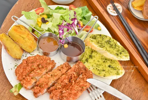 這份套餐內容有歐姆蛋、炸雞、烤土司、生菜沙拉、水果