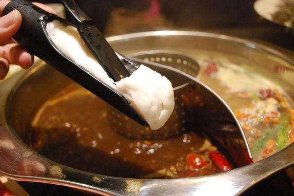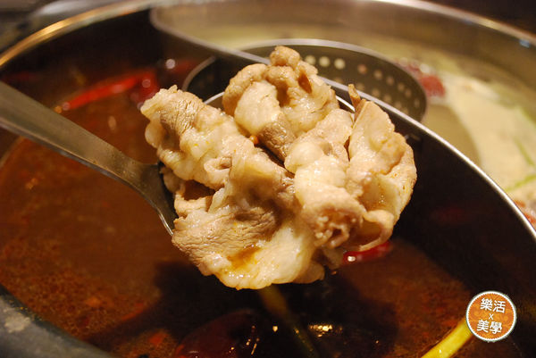 而火鍋湯底有白醬牛奶、四川麻辣、蒙古蒜香、義式蕃茄、和風昆布可以做搭配,今天我選的是四川麻辣與蒙古蒜香,一次可以吃到兩種不同風味,從鍋底撈起來可以看到是用真材實料下去做的,在煮湯頭部份非常用心。
