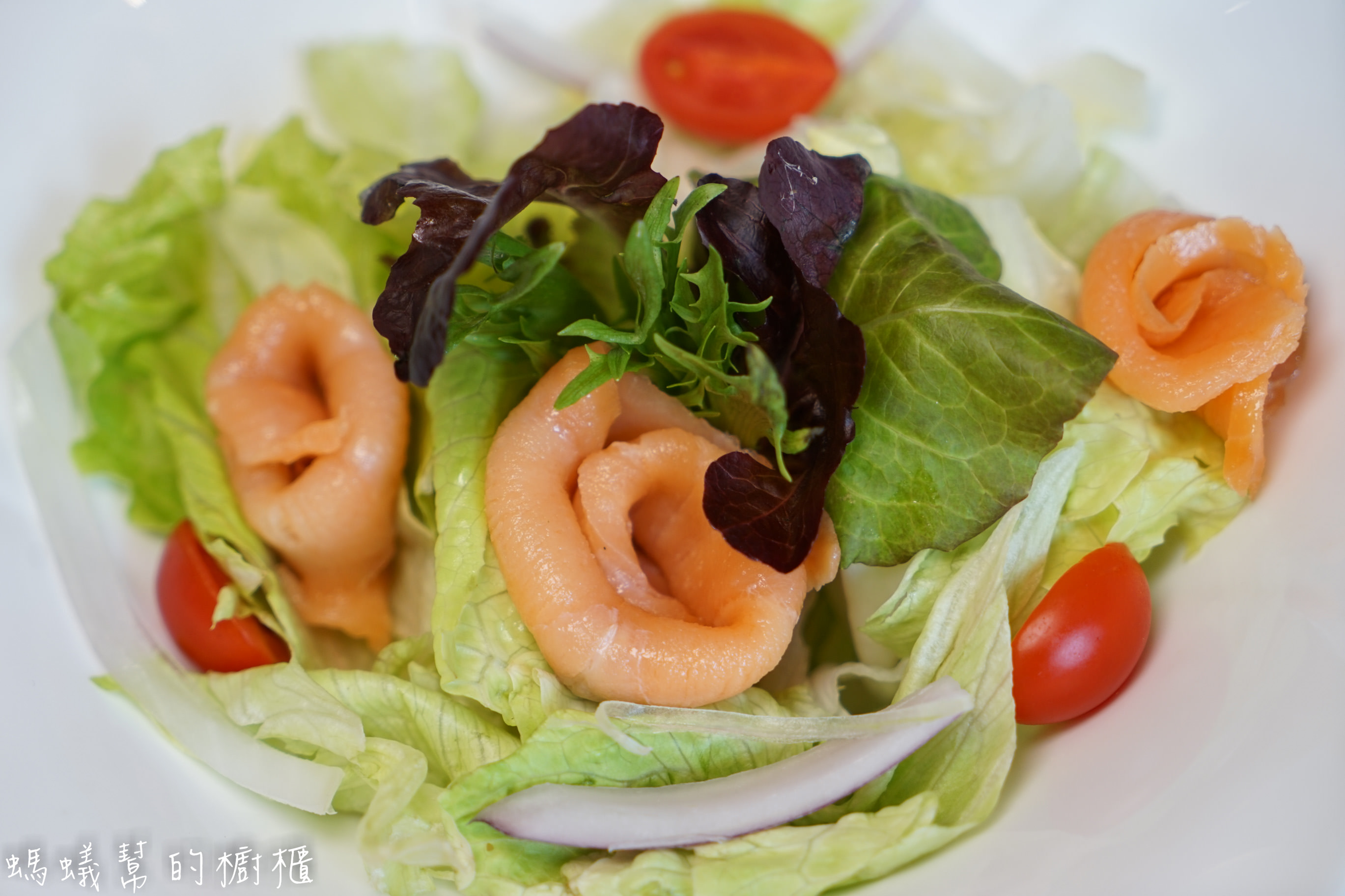 鮭魚花欉佐蜂蜜芥末。個人很喜愛吃醃燻鮭魚,加上捲成花朵的造型看起來精緻典雅,新鮮的生菜搭配橘色的鮭魚肉片,有如花團錦簇般的氛圍。
