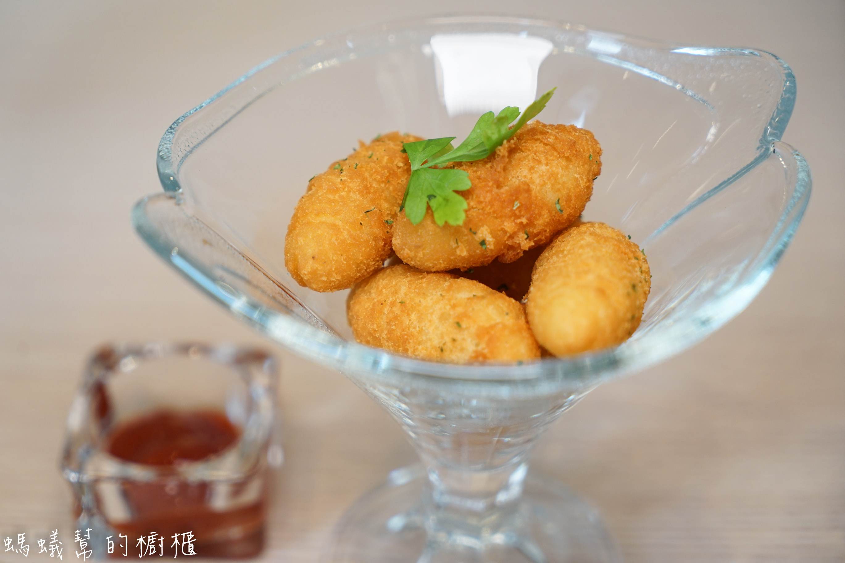 目前用餐打卡都會送上這份特製的松果薯球,外酥不油膩,裡頭則是鬆軟的薯泥,單吃就非常好吃了呢。