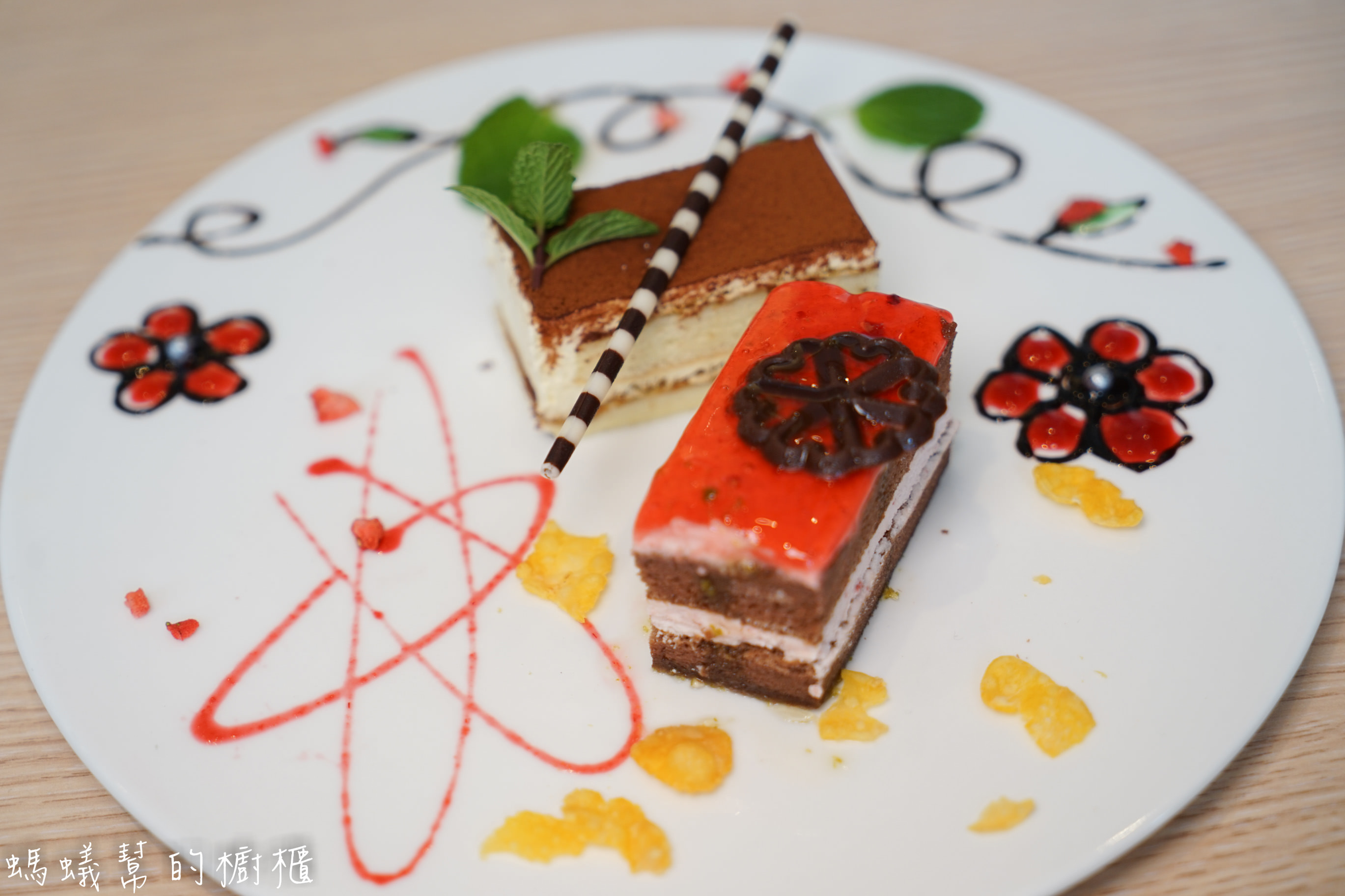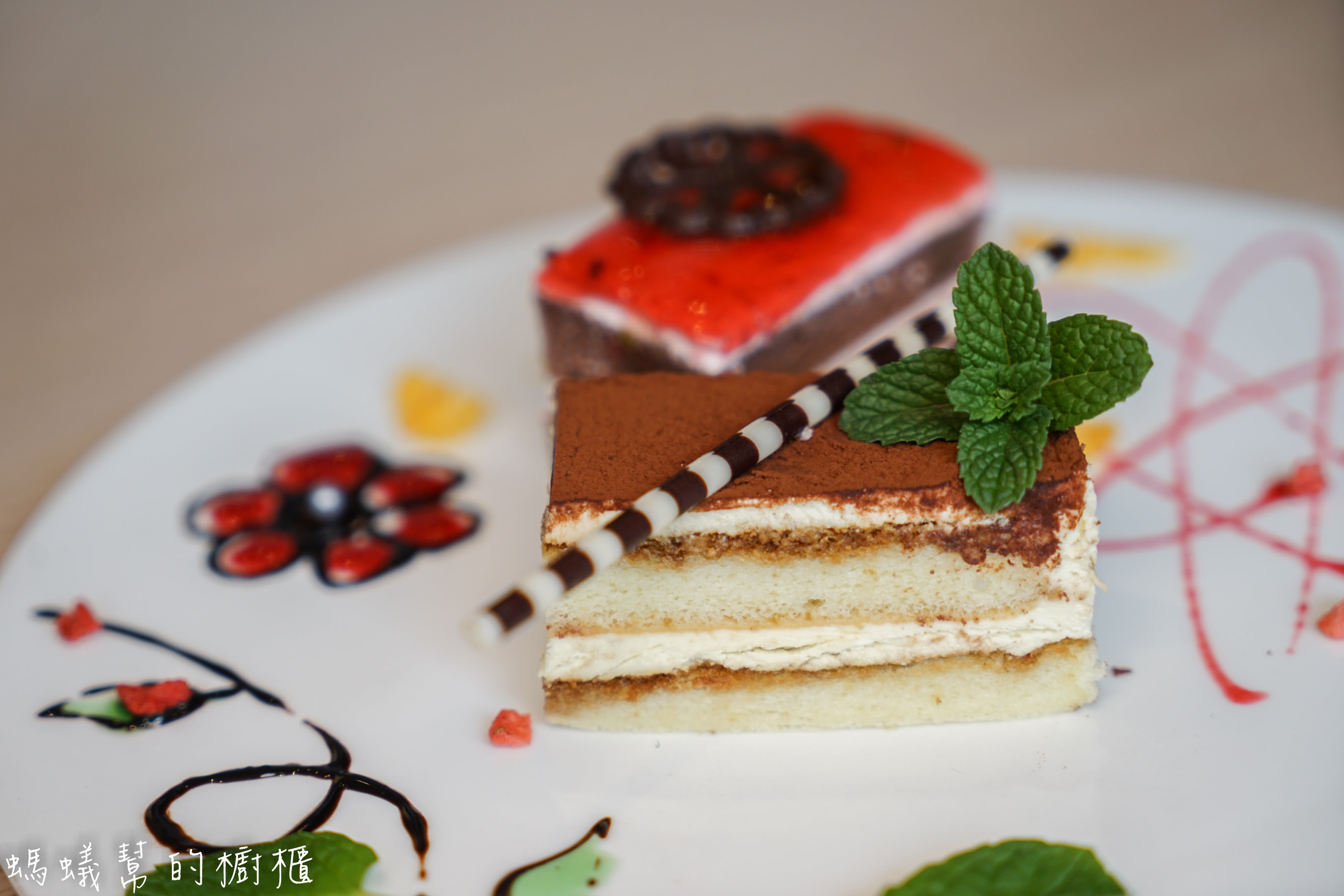 提拉米蘇&覆盆子慕斯蛋糕。蛋糕的質感細緻不馬虎,輕柔的提拉米蘇蛋糕不甜不膩,覆盆子幕斯則帶著酸甜的果香滋味。