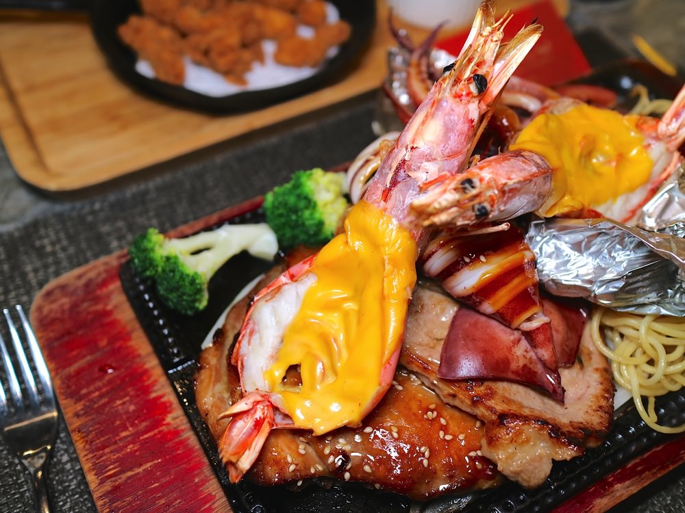 送上來時,真的就是這樣一個大鐵板,上方的好料疊高高!