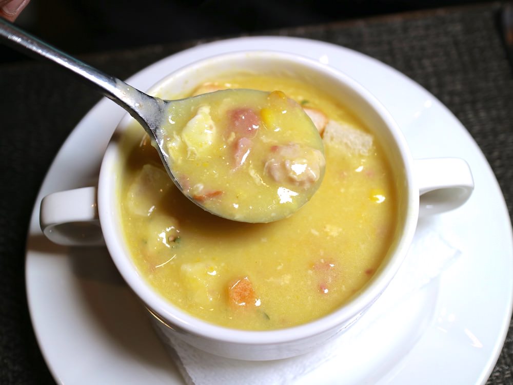 每一口濃湯都有濃郁的玉米滋味,裡面也有滿多的金黃玉米粒、火腿、肉末,還有絲絲蛋花。