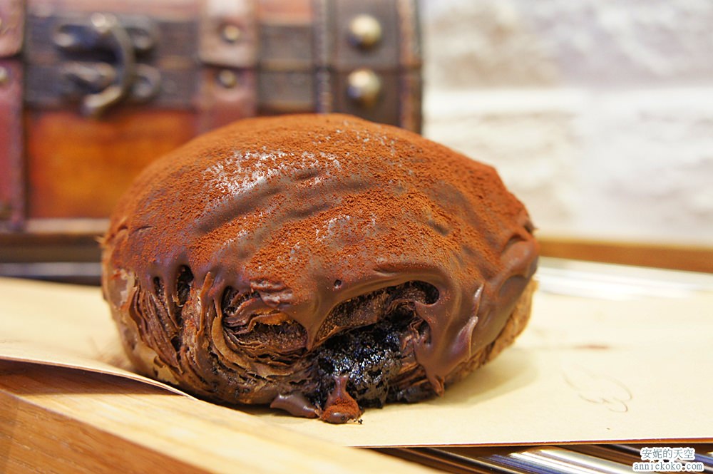 手工18層的巧克力丹麥麵包,18小時的自然發酵,麵包裡捲入80 %的自製苦甜巧克力,還有加上榛果牛奶,所以吃起來不會膩口,滿滿都是幸福滋味。