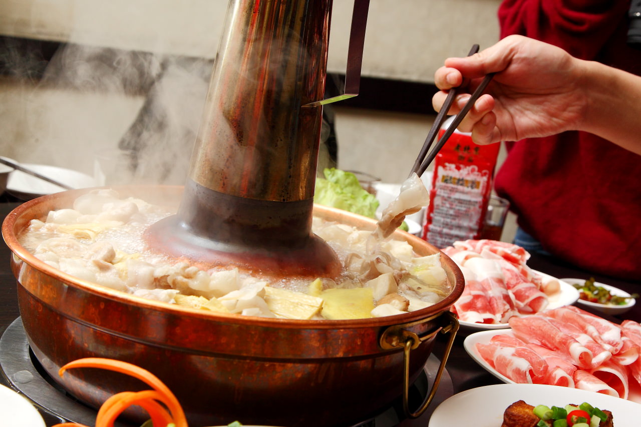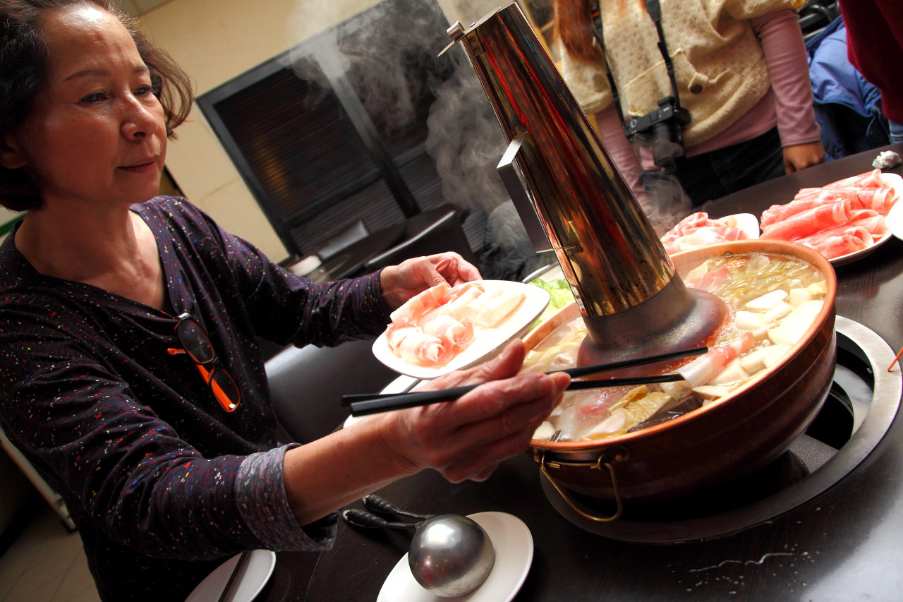 熱呼呼冒著白煙的酸菜白肉鍋上桌囉,中間有一個長長的煙囪,這裡是使用中間有煙囪的「炭燒銅鍋」,靠著煙囪上面的氣閥可以控制炭火火力的大小