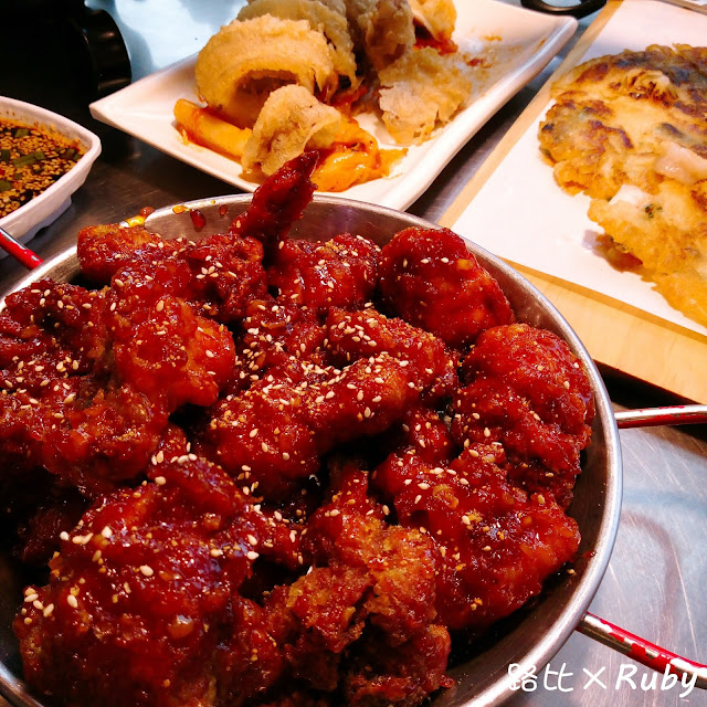 大叔炸雞-辣醬味,原本點了韓式炒飯結果店員疑問我們不點炸雞嗎XDD推薦我們要吃看看然後就腦波弱到把炒飯改炸雞,結果真的好好吃😋心中的魷魚排名直接被炸雞給取代😂(二次都想吃炒飯最後都沒吃到😂)