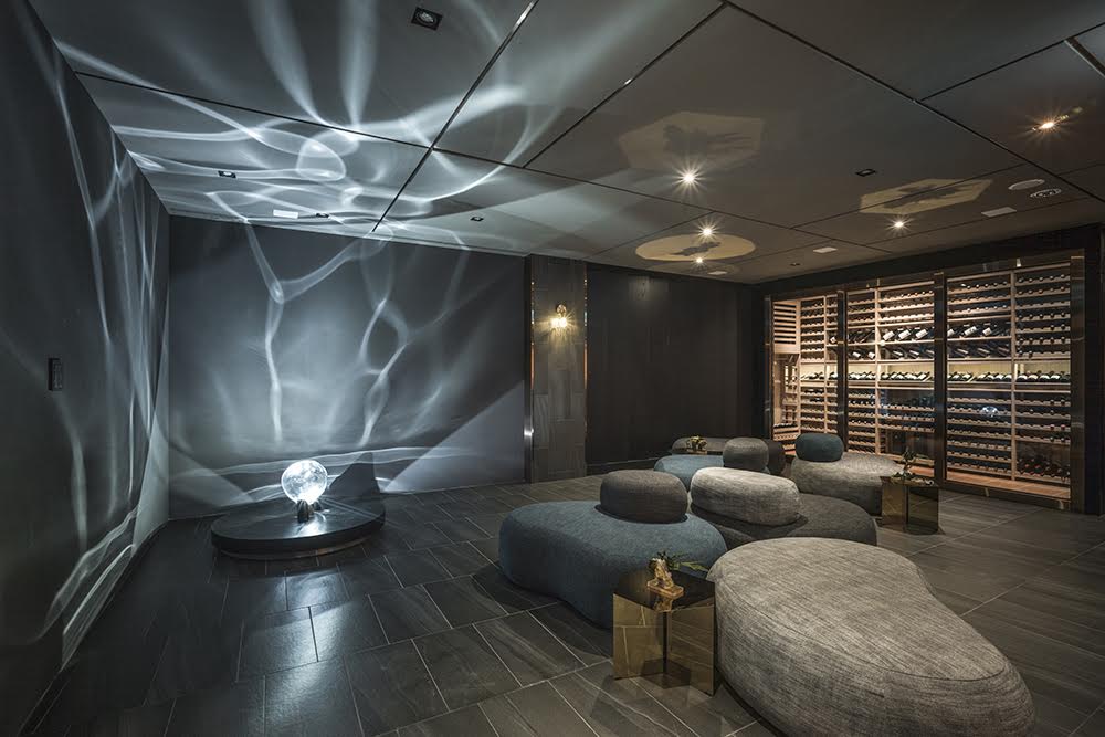 沿著餐廳門口的藍綠色長廊走過去,10 席的專屬包廂空間就隱藏在這裡,緊鄰著酒窖櫥窗!包廂外是流線的原石造型沙發區,與酒窖、造型原石相呼應的Poetic Lab 燈光藝術作品「波光Ripple」,以吹拂過的水面波光倒影為靈感,交織而成波光粼粼的水波光影畫面。