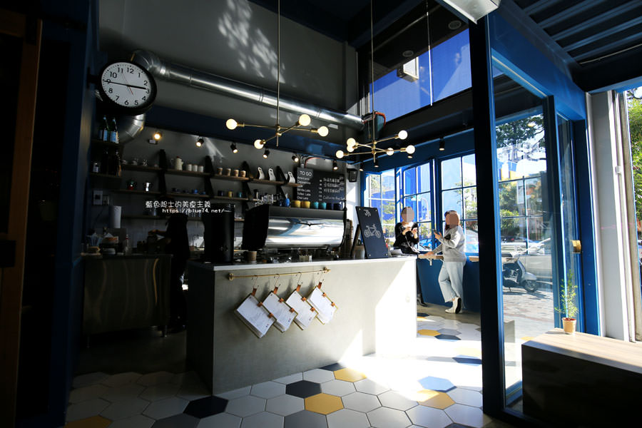藍色系的樓中樓雙面店,水泥地搭配六角蜂巢彩色磁磚