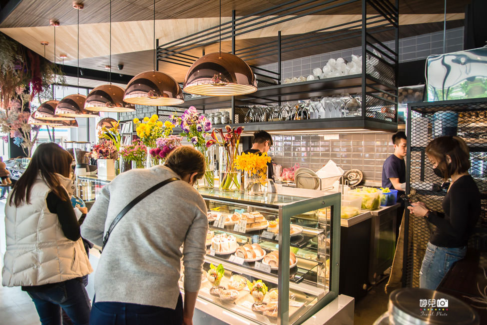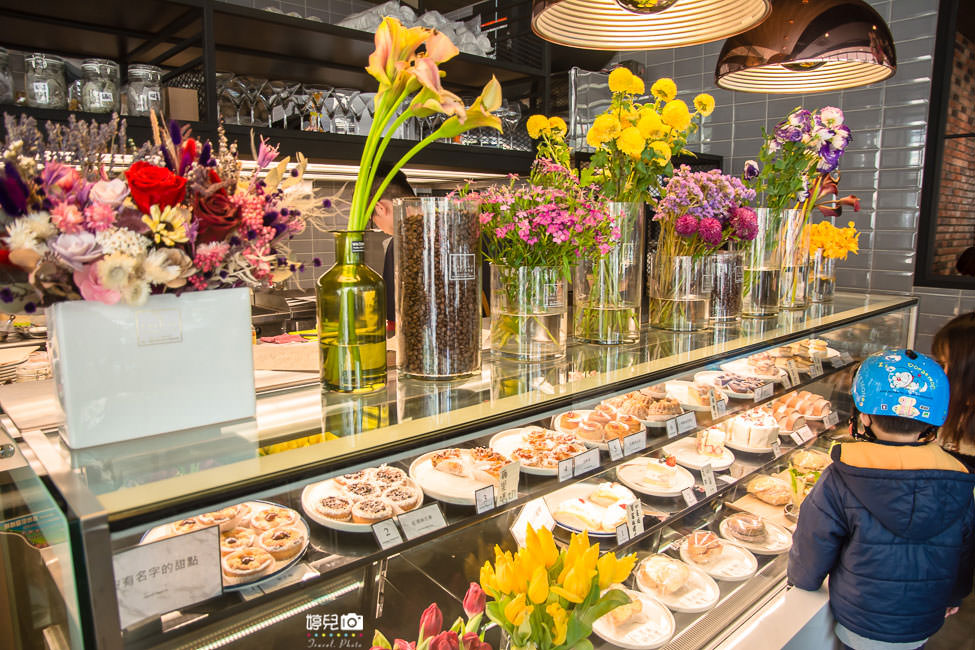 櫃台乾淨又整齊,旁邊的甜點櫃上面擺放著各式各樣的花卉,這畫面好美!