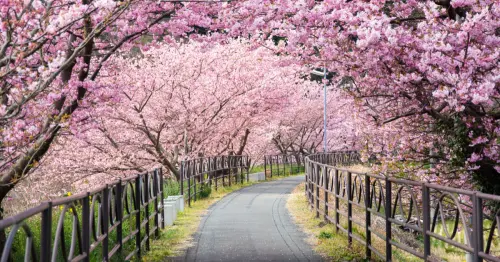 ◎迷人的河津櫻是大島櫻和寒緋櫻合成的自然種,河津川旁盛開的河津櫻交織成櫻花隧道…