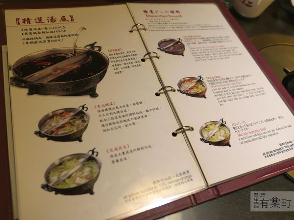 用餐採單點式,先選鍋底,再選想吃的肉品、青菜及火鍋料。精選湯底一人是120元,鴛鴦鍋則要加收180元。湯底口味有特香麻辣、東北酸菜和高湯蔬菜三種,選了特香麻辣和高湯蔬菜組合成鴛鴦鍋,讓喜歡吃辣與喜歡清爽火鍋口感的家人都可以吃得盡興。
