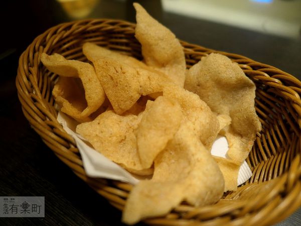 入座後,會先送上熱水與蝦餅,邊看菜單時邊吃蝦餅還蠻妙的,蝦餅脆脆的,不會很油。