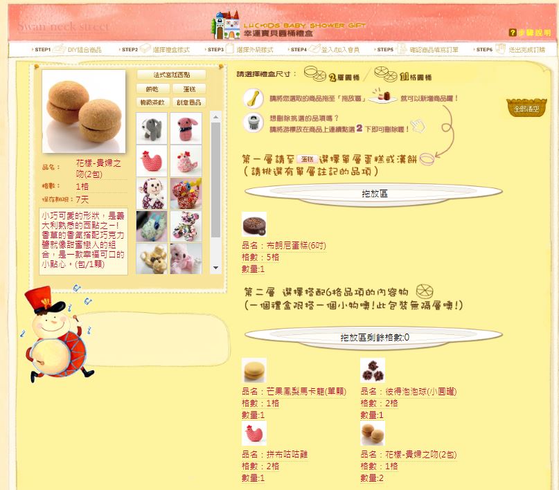 ▼他們的網站設計的也很不錯,可以自由將喜愛的品項拖曳到托放區,就可以新增商品囉!像是第一層可以選擇單層蛋糕或漢餅,第二層則可以選擇六格的甜點品項;不僅有圖文可供參考,且選定好的商品數量與內容物也讓人一目了然!