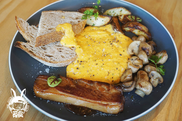 包含了兩片歐式酸麵包、法式炒蛋、烤馬鈴薯、野菇
