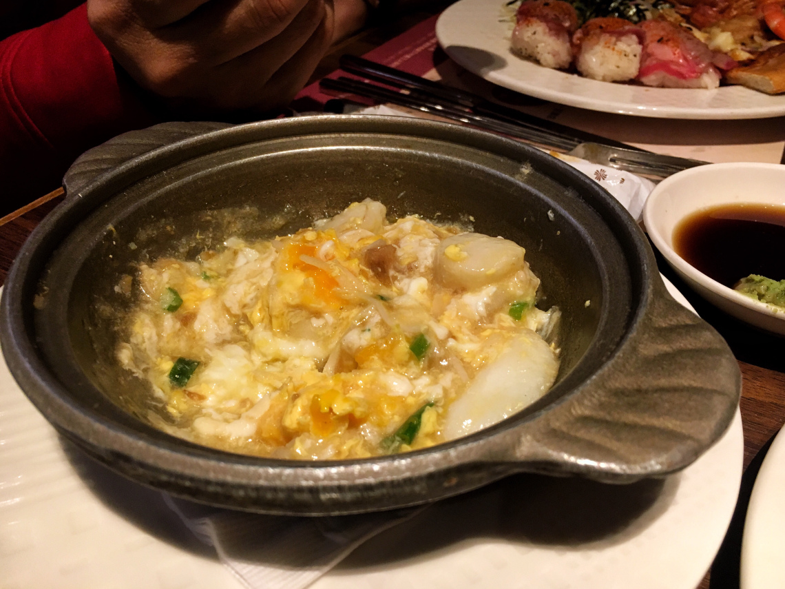 鐵鍋裡的干貝蟹肉煲滿受歡迎的樣子,裡頭除了干貝、蟹肉之外是滿滿的蛋