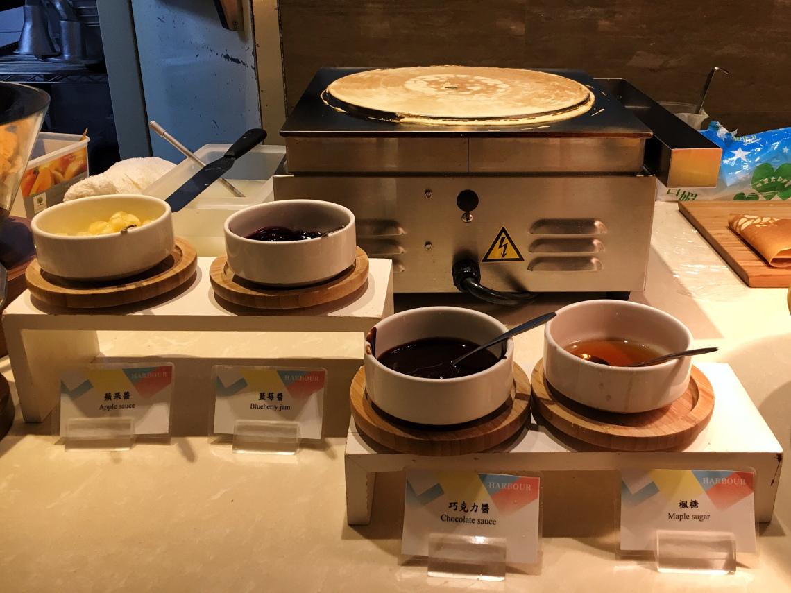 現做可麗餅看起來偏台式脆餅皮,有果醬、巧克力醬等配料,或是走到旁邊冰櫃加一球冰淇淋