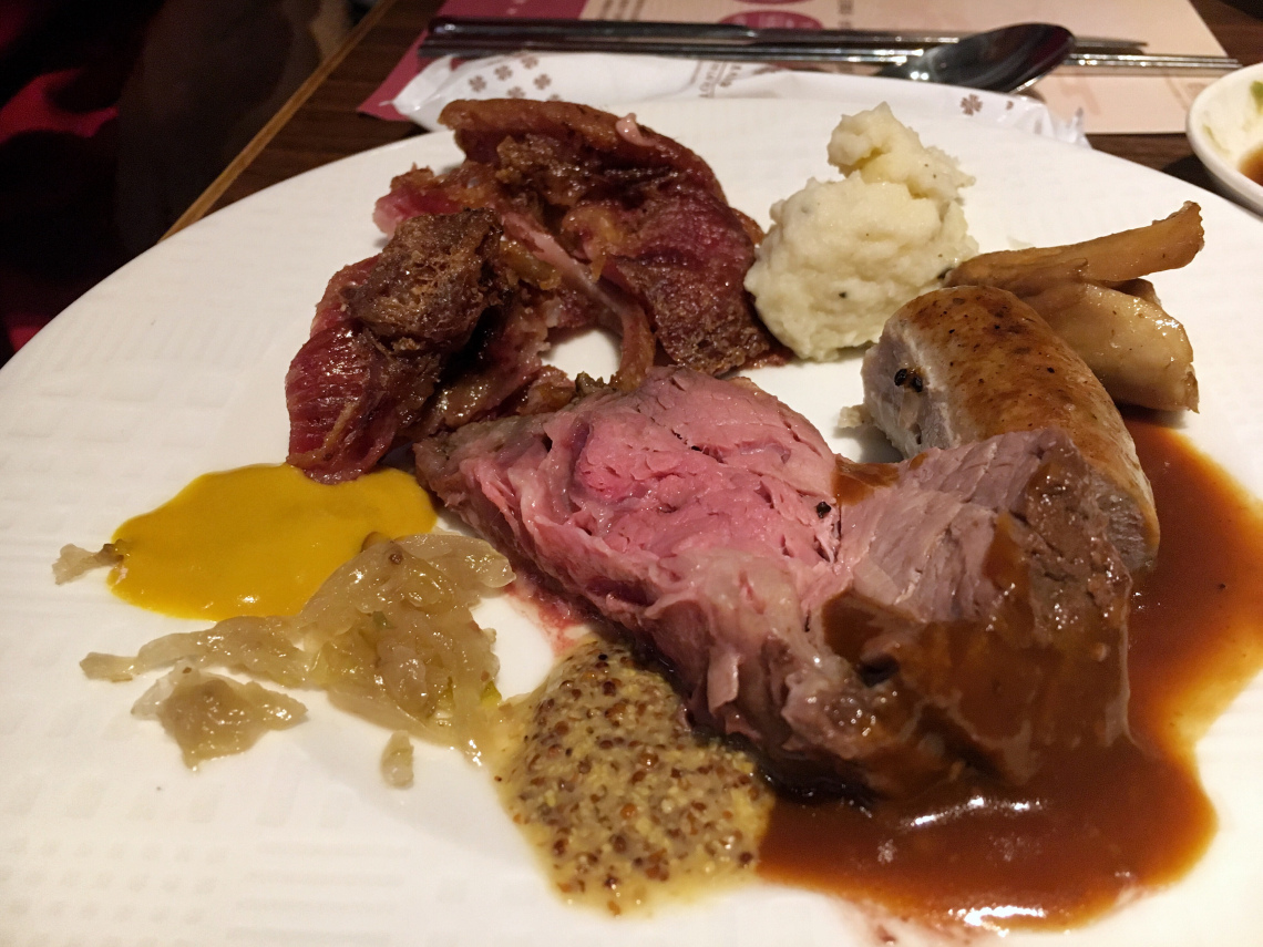 專人服務部分則有烤牛肉、德式傳統圈腸與多種醬汁,我的心頭愛是芥末籽醬和玫瑰鹽交替著沾