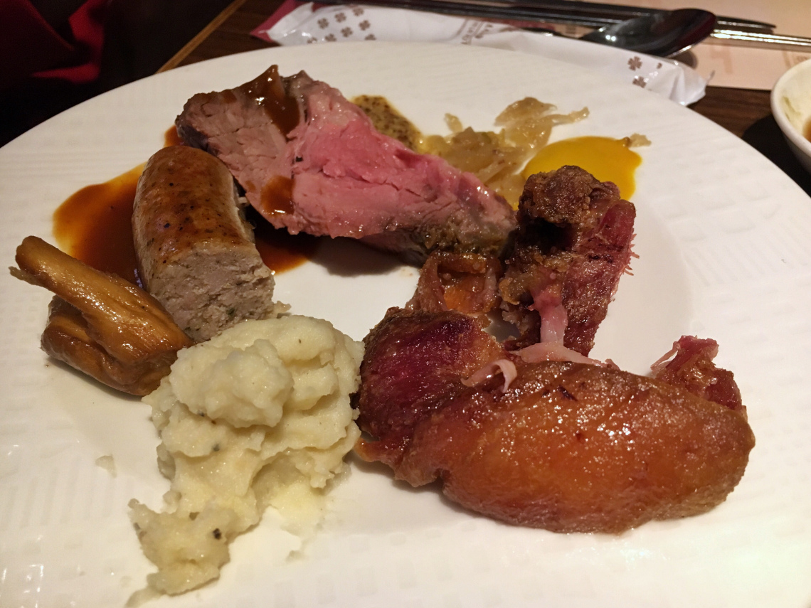 相對清爽的前菜(?)吃完後來點重口味的肉類,自取部分有一定要脆皮的德國豬腳沾芥末與酸菜、不是最綿密但味道不錯的松露馬鈴薯泥
