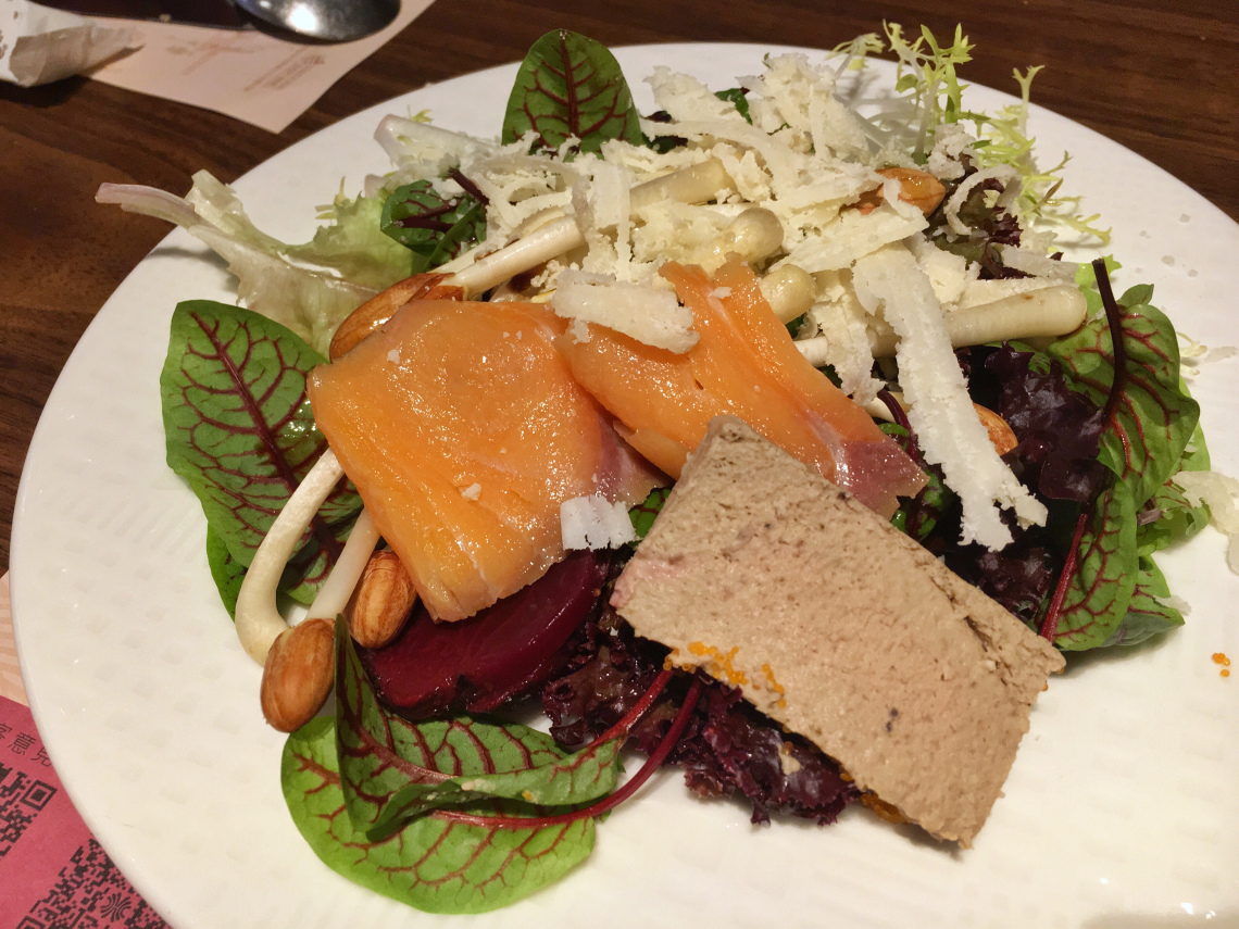 吃著吃著總要夾點生菜以假裝健康,可以看到這裡不只有基本款的羅曼生菜,還有甜菜根、萵苣、燻鮭魚和自製鵝肝醬等,最吸引人的是旁邊的整顆帕瑪森起司輪,想吃多少就刨多少 🧀