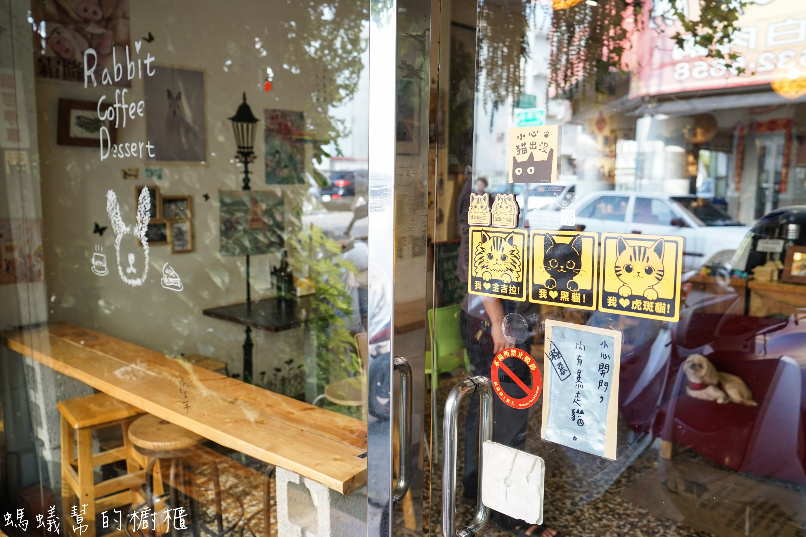 門口的玻璃門上貼了金吉拉、黑貓、虎斑貓三只可愛貼紙,開門的時候請小心,因為調皮的小虎斑總是趁著客人開門時偷偷跑出去閒晃,晃夠了時間才願意乖乖回店裡。:D