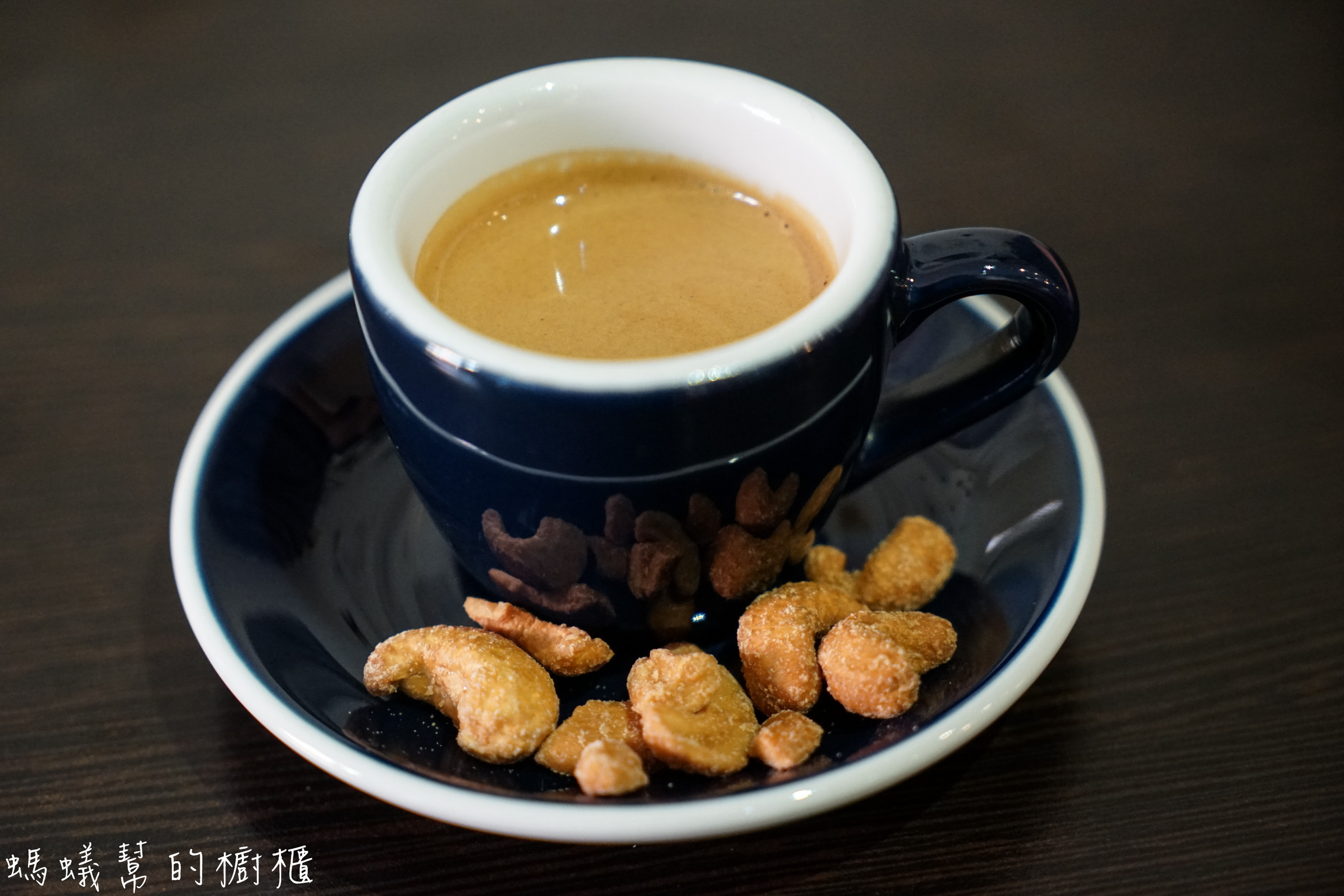 義式濃縮咖啡還附上一些腰果,讓人感覺窩心;咖啡豆是自家烘焙,另也有單售咖啡豆。