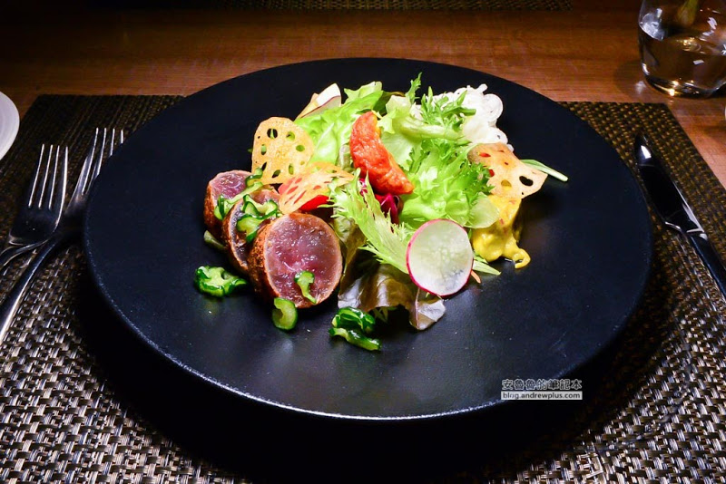 用多種食材將生菜包圍,有細麵狀的山藥、醃黃瓜、新鮮小蕃茄、烘烤過的小番茄、炸蓮藕片、酪梨沙沙、煙燻酒蛋,以及炙燒到外層已經呈現乾脆,內層卻還是軟嫩生魚片口感的鮮鮪魚,淋上微甜微辣不死鹹的和風芥末醬,吃起來是西式和日式完美的結合。值得一提的是這鮪魚還挺大一口的,一口吃下去嘴裡有滿足的口感和咬勁
