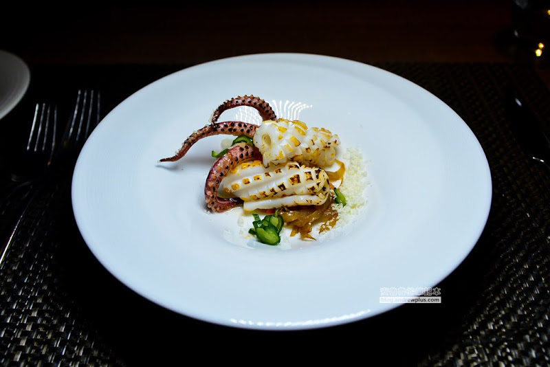 看到菜單上的照片就決定要選這道和平常吃到不同造型的小卷,小卷肉質超軟嫩,外皮故意烤得有點焦焦的,吃起來不但有口感還帶點焦香味,同時勾動你的味覺和嗅覺,底層的洋蔥有炒出焦糖般的香甜,配上特製的醬料、醃黃瓜、鮭魚卵、橄欖油粉,看起來簡單卻是不平凡的好味道