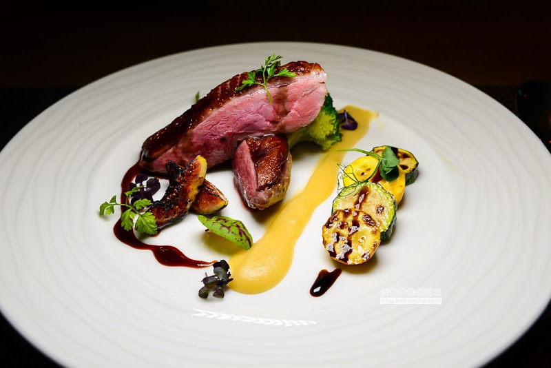 兩大塊鴨胸在熱瓷盤的保溫加持下,從頭到尾的維持相同的風味,可搭酸甜的紅酒無花果醬、香草蘋果泥、烤櫛瓜一起享用,看起來鴨胸肉像是經過舒肥處理,肉已經是全熟的狀態,但吃起來超級軟嫩多汁,一點都沒有老柴乾硬的問題,吃鴨胸肉一定要和鴨皮一同入口這樣才能吃到鴨胸的香味和帶點嚼勁的口感。