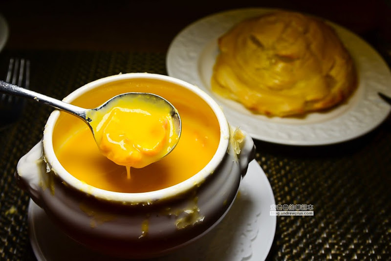 湯品上桌的時候附上一個盤子,服務人員說要把酥皮放在盤子裡面,然後分成小塊吃,千萬不要整個酥皮壓進湯裡面,不然會把真材實料的南瓜湯給吸乾乾