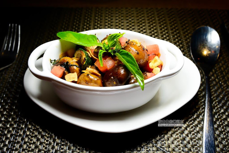 飽滿肥美的蘑菇沾附著松露,裡面還有新鮮的蕃茄和帶點焦苦味的櫛瓜,並配上蒜片 。蘑菇吃起來有豐富的水分,松露將提升了整道菜的風味,喜歡吃菇菇的朋友一定會和我一樣一口接著一口