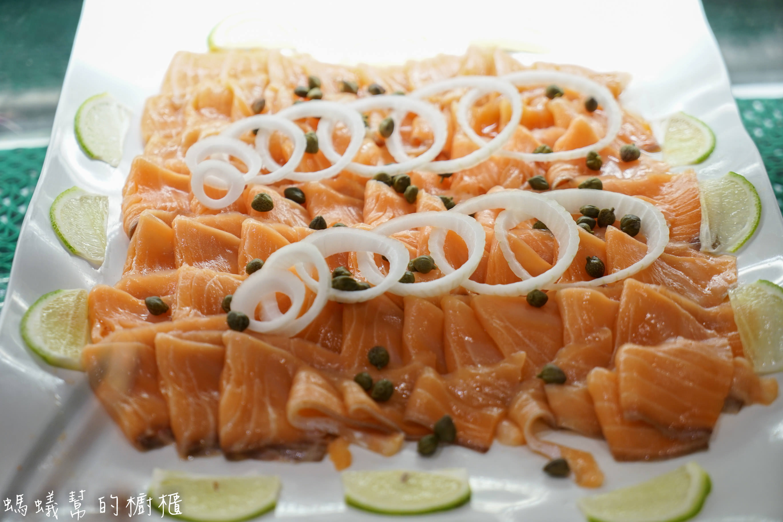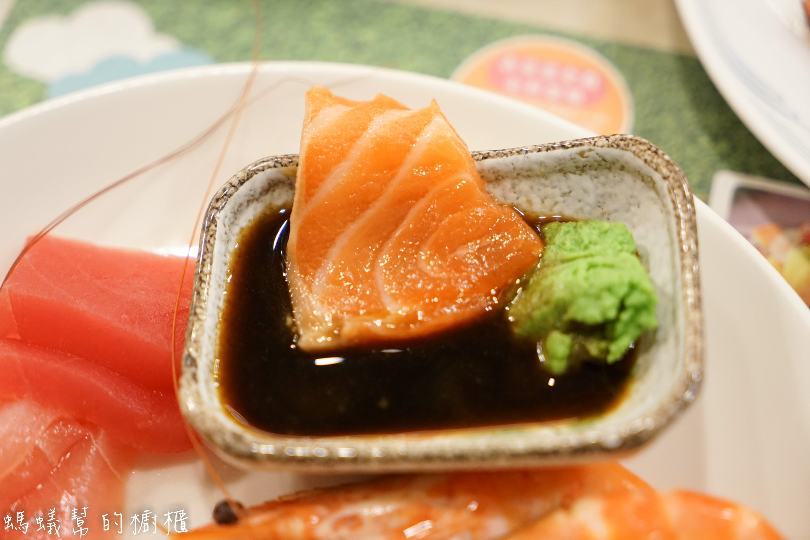 接著就是超級受歡迎的生魚片、海鮮冷盤區,有新鮮各式生魚片,橘色的煙燻鮭魚、冰鎮白蝦、旭蟹,讓海鮮迷們絕對先鎖定這區域!