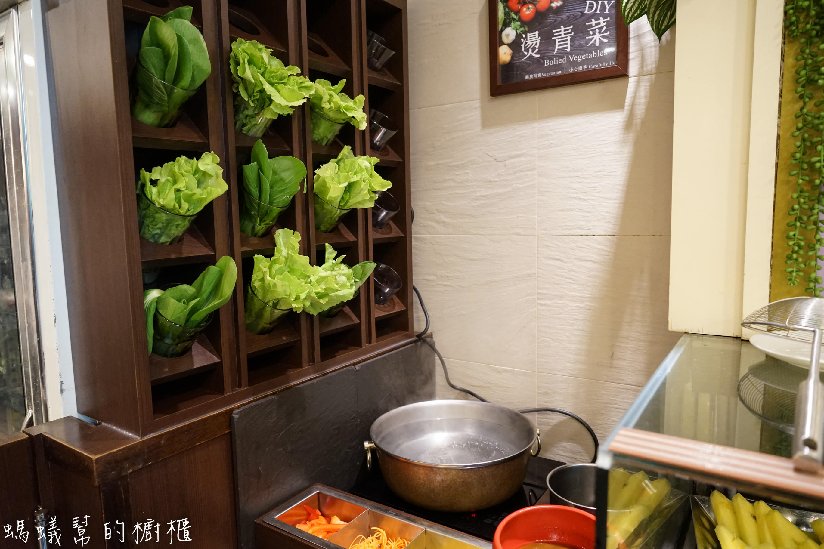 想吃的比較清爽,還有特別設置自助式燙青菜區,綠色蔬菜放置在左邊牆格上,非常有創意又吸引目光呢。