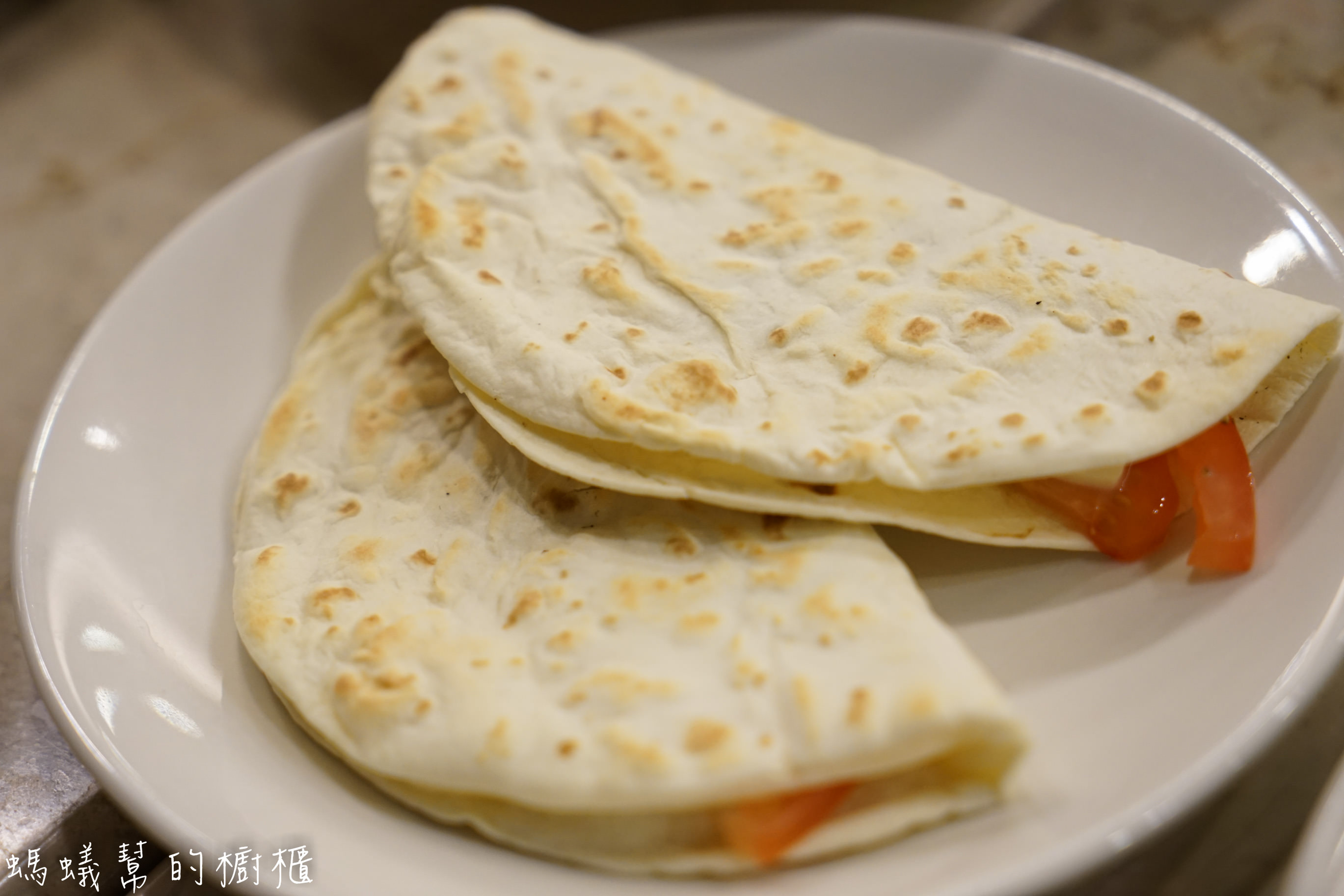 義大利薄餅裡夾著新鮮番茄跟馬茲瑞拉起司,微微鹹香搭配餅皮Q彈感,越吃越香。