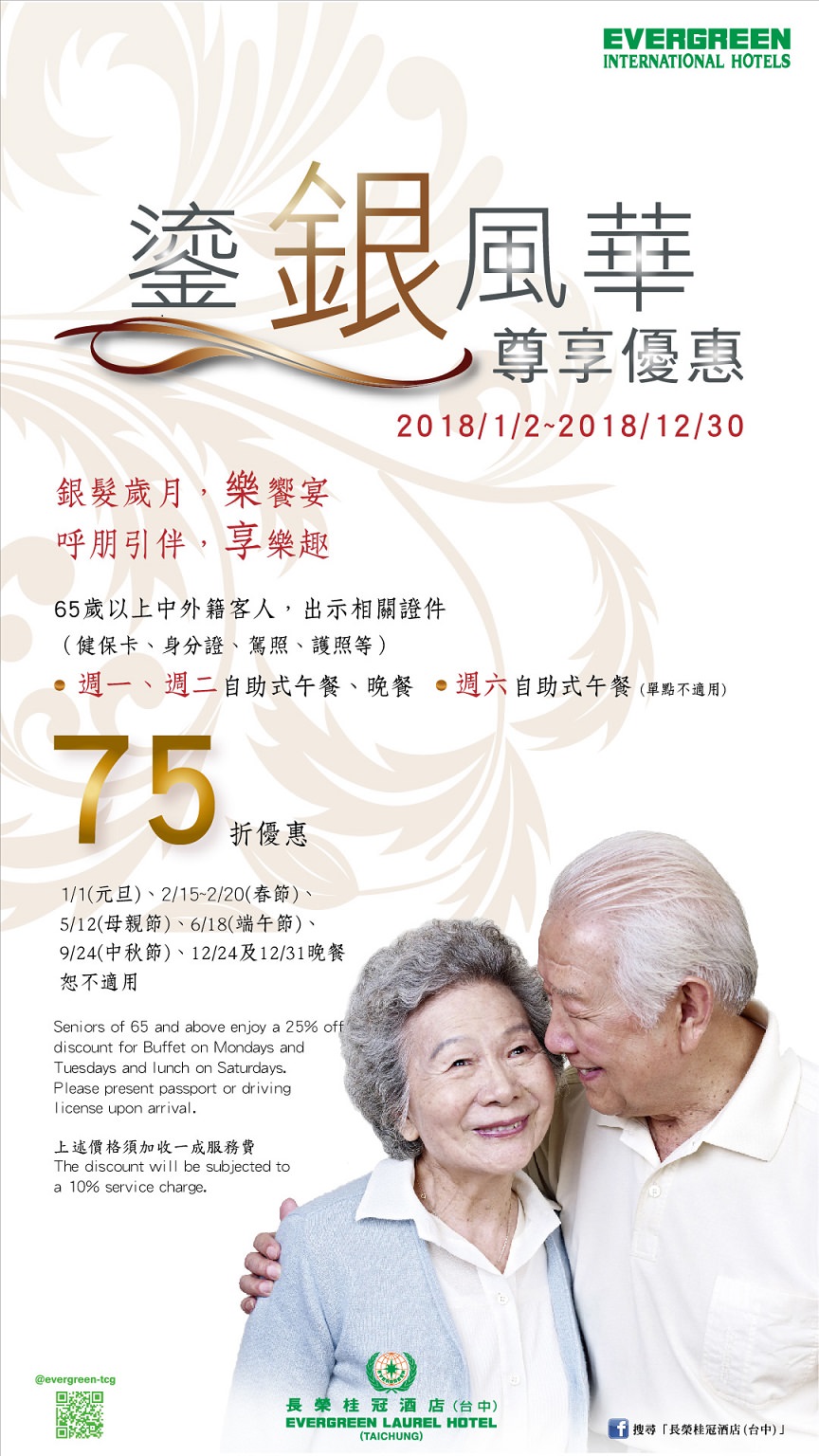 65歲以上中外籍客人只要出示證件,週一週二自助式晚餐、週六自助式午餐享75折優惠!(需加收一成服務費)