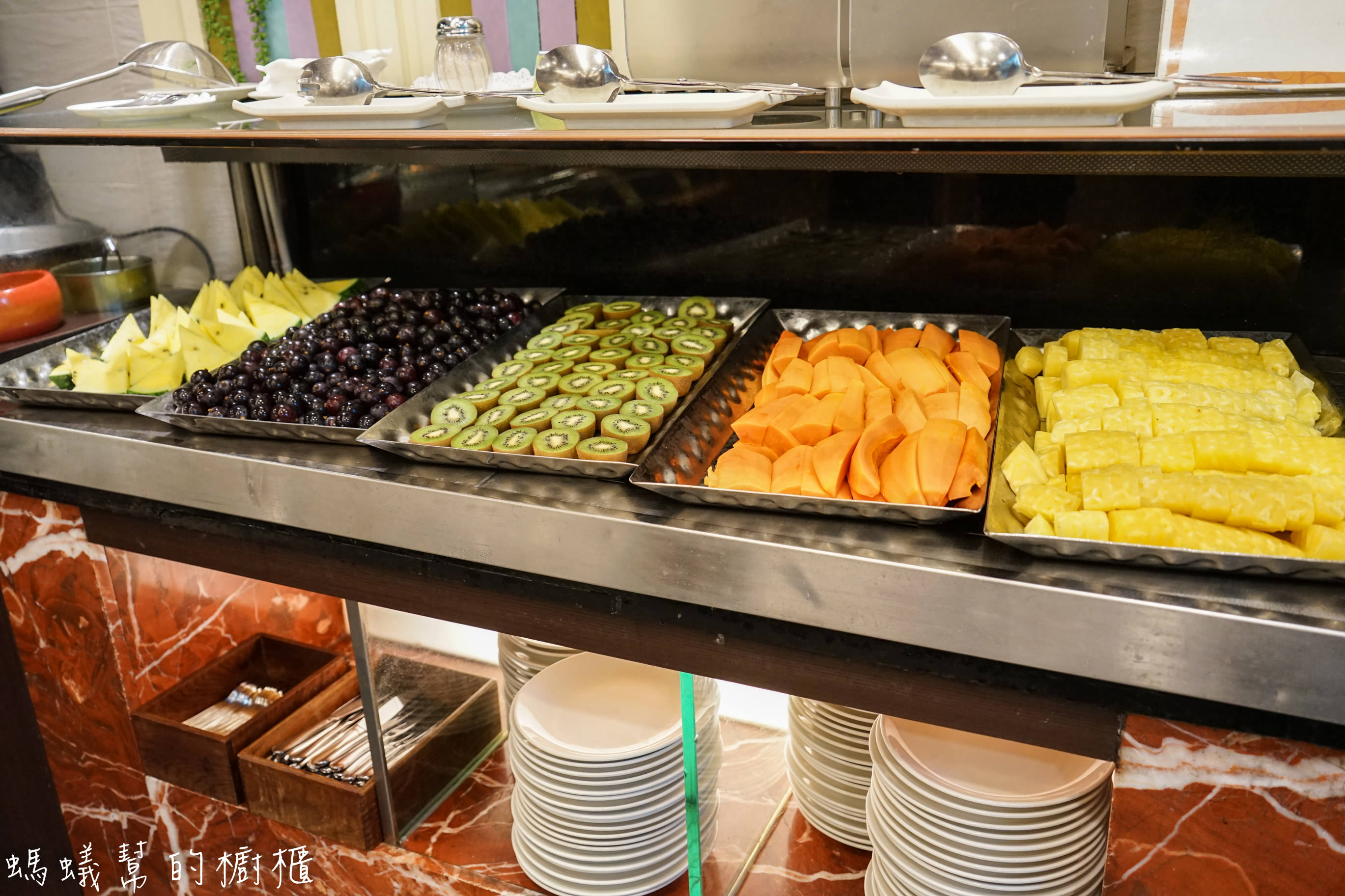 不少人習慣飯後吃點水果,水果區就提供了新鮮且都是受歡迎的水果品項,鳳梨、木瓜、奇異果、葡萄、西瓜,因為長榮桂冠裡用餐的客人有一些是外國客,還可品嚐到台灣特色水果,鳳梨跟木瓜、葡萄的選項就很有代表性。