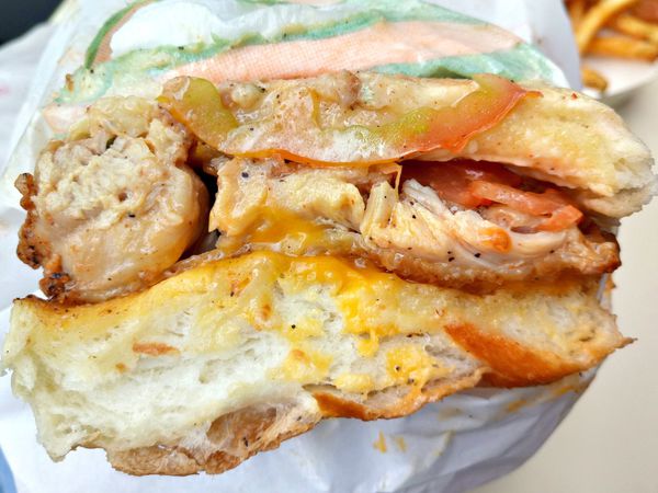 漢堡麵包非常鬆軟,夾著生菜、洋蔥、番茄等基本配料,鋪上一層起司,還夾著那讓人魂牽夢縈的雞腿排!