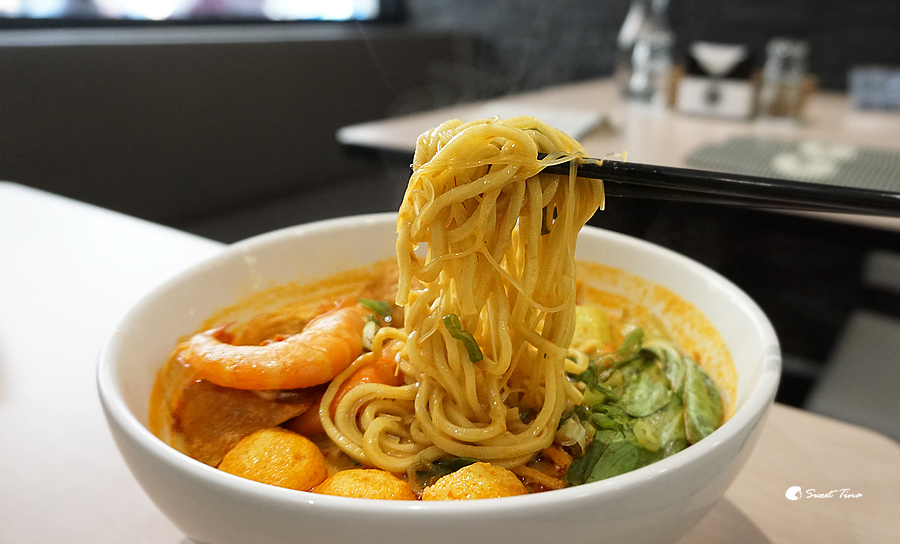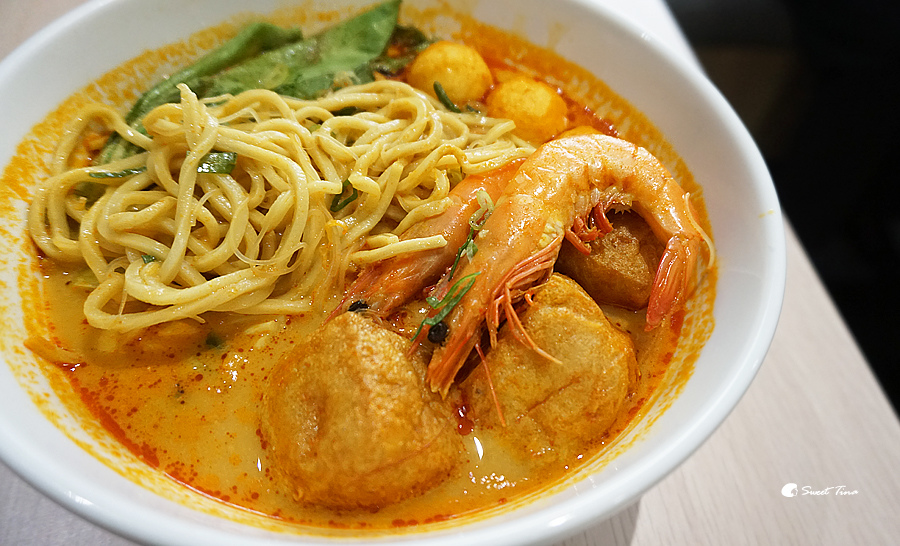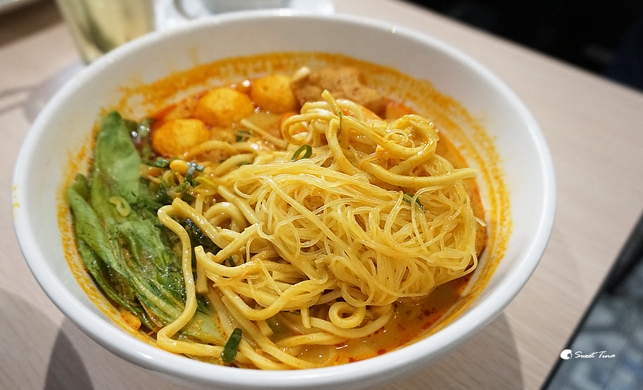 海鮮拉薩湯麵 - 基底和咖哩魚旦的配料及醬汁相同,但加入海鮮後讓湯頭更棒了,配料除了魚丸、豆皮、還加入了蝦子、花枝、蔬菜..等,份量相當十足喔。