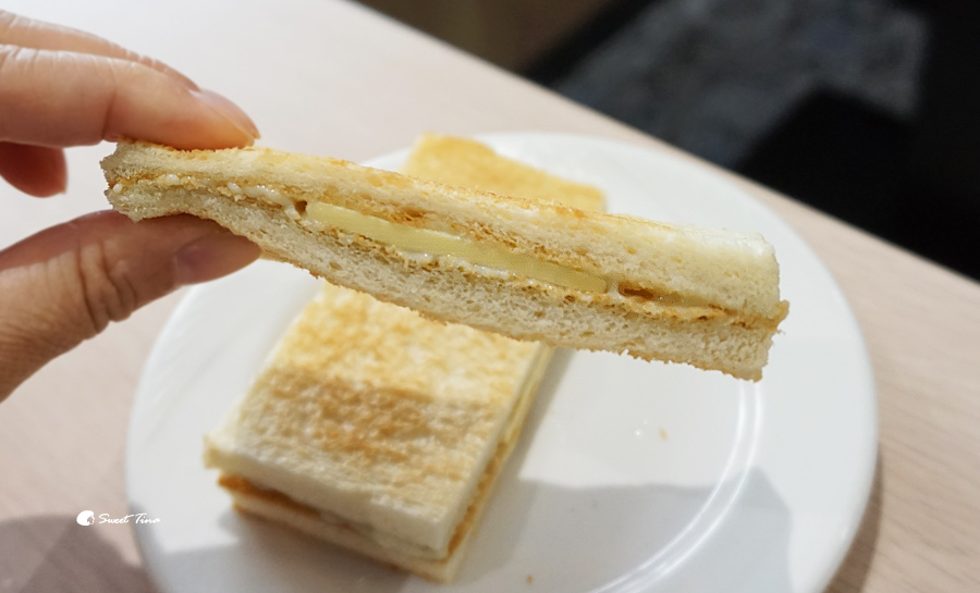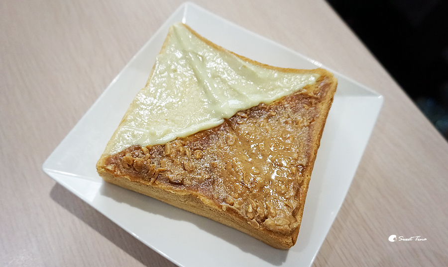 鴛鴦厚吐司 - 咖椰醬及花生醬各半,可同時享用二種不同的口感,咖椰醬香濃微甜,而花生醬則是鹹香味十足,每口都還可吃到花生顆粒,搭配起來還滿特別的。