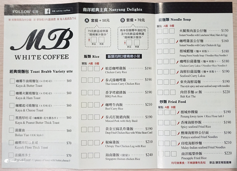 座落東區的MB white coffee提供了多樣化的南洋料理,餐點美味價格也滿平實的,所以用餐時間常常座無缺席,而餐點內容有套餐也有單點式的,一個人用餐或是多人聚餐都很適合。Tina本身也相當喜歡南洋料理,MB white coffee的餐點味道濃郁但又不死鹹,和家人一同用餐後的感覺都還滿不錯的,喜歡南洋料理的朋友千萬別錯喔。