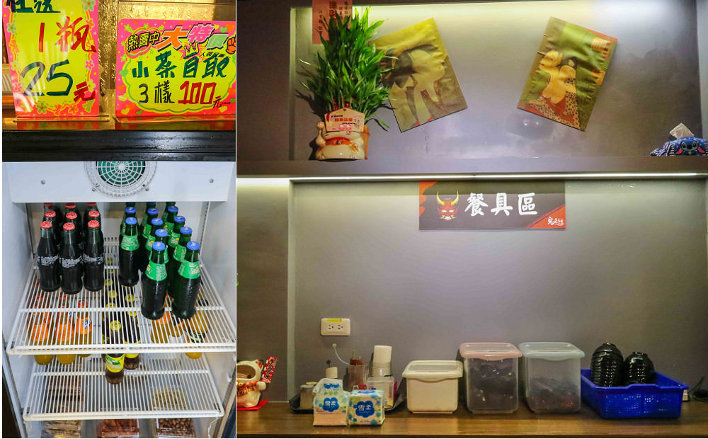 餐具、調味料區和可口可樂系列的瓶裝飲料,需要自己動手拿,再到櫃檯結帳即可。