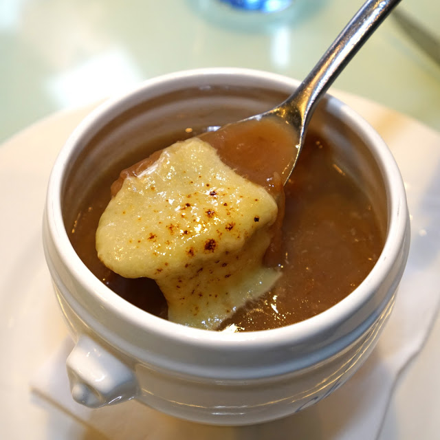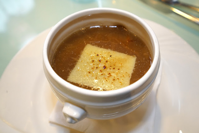 湯品的部分我們選了經典海鮮清湯與康堤起司洋蔥湯,海鮮湯以空盤盛裝著生魚片上桌,再以熱高湯澆注成這道海鮮清湯,湯頭滋味很鮮甜,魚片更是鮮嫩不已。