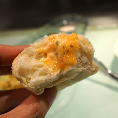 很快的送上烤得暖暖的帕瑪森起司麵包,香軟的麵包抹上特製的蒜香柳葉魚子醬,鮮甜的滋味讓人很想吃第二個,雖然麵包是無限量供應,但想到後面還有份量頗多的主菜,就不敢再多吃。