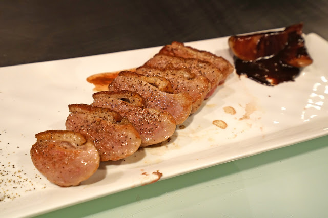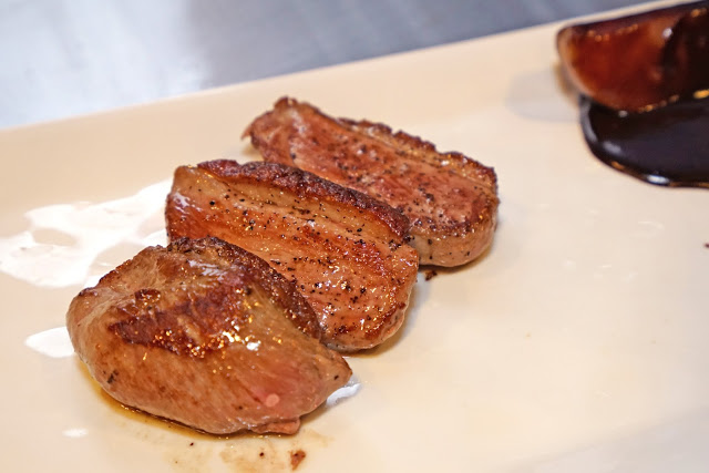 先切下三片煎得肉汁飽滿、內層軟嫩的鴨胸讓我們淺嚐,確認熟度後再把其他的鴨胸煎出來。