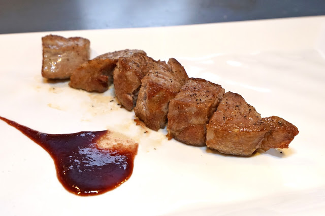 最後看著主廚聚精會神地幫我們準備伊比利豬肉,從西班牙來的伊比利豬擁有「勞斯萊斯級豬肉」的美譽,從小放養野外的伊比利豬,以野草、香草及橄欖等維生,擁有細膩的油花,裡頭蘊藏橡樹果實的香氣,讓人十分期待。
