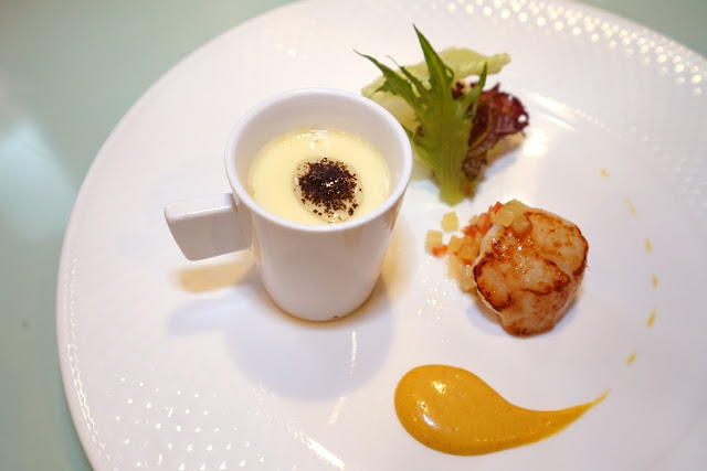 第一個上桌的熱前菜以生食等級的北海道干貝為主角,煎得熟度恰到好處,外表酥香內層依舊維持軟嫩,曼妙的口感讓人很想再吃第二枚,還好後面的主菜還有干貝!
