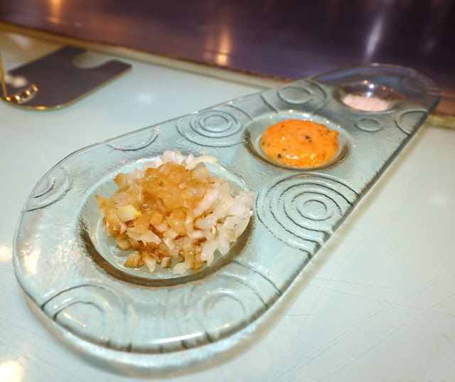 入座時桌上已經擺好佐料盤,包括洋蔥、蒜香魚子醬、海鹽,可搭配著餐點使用。